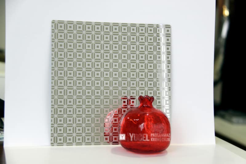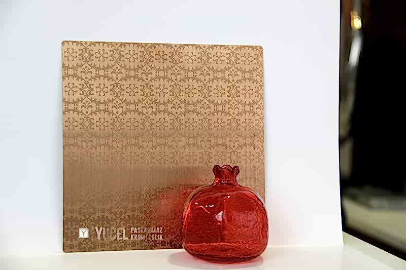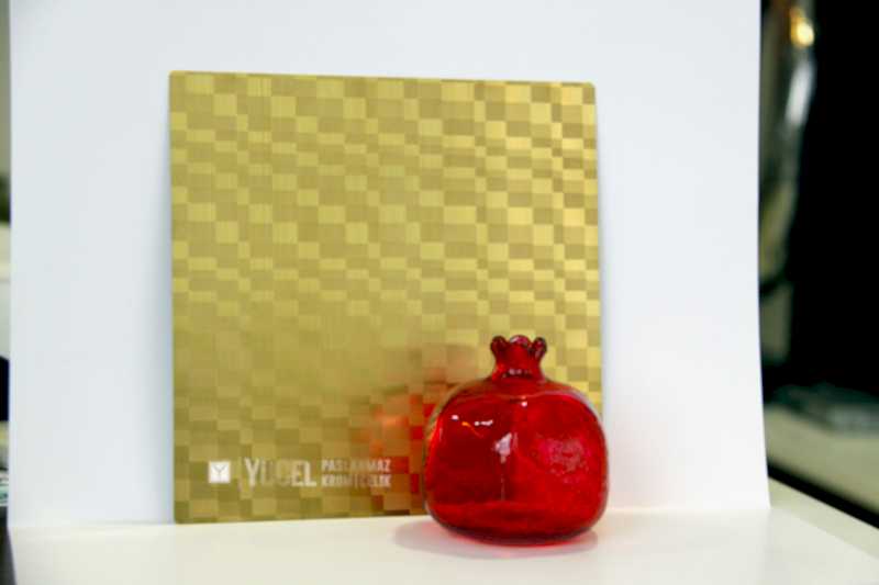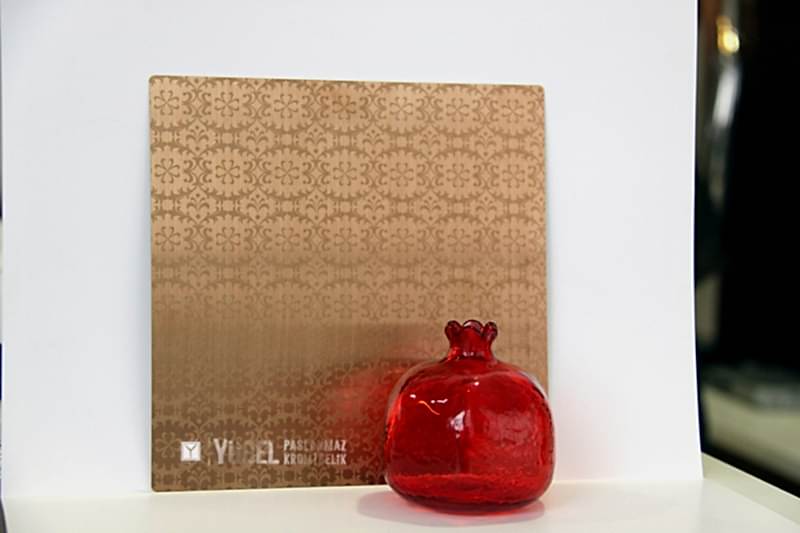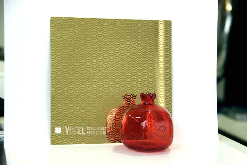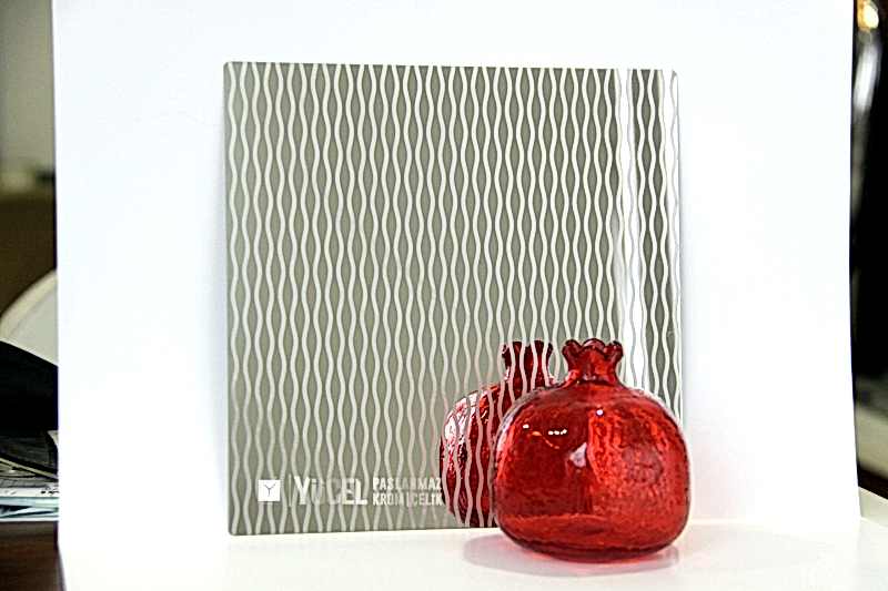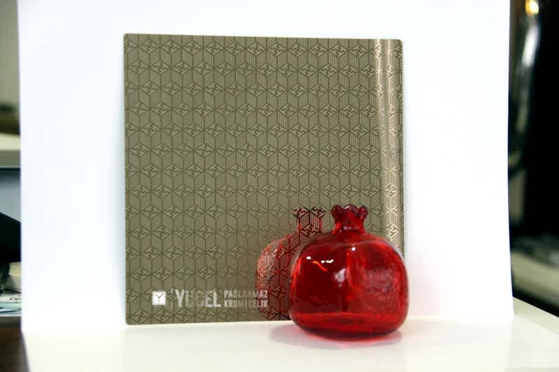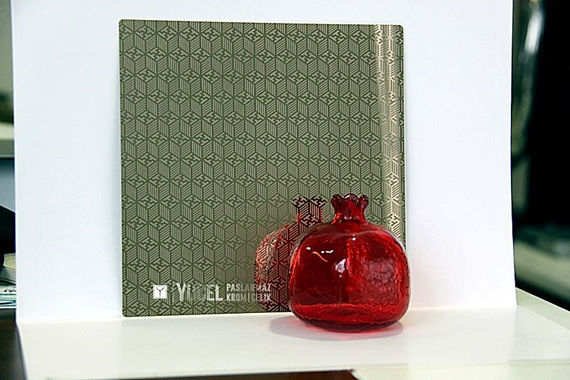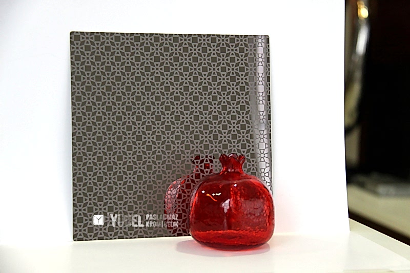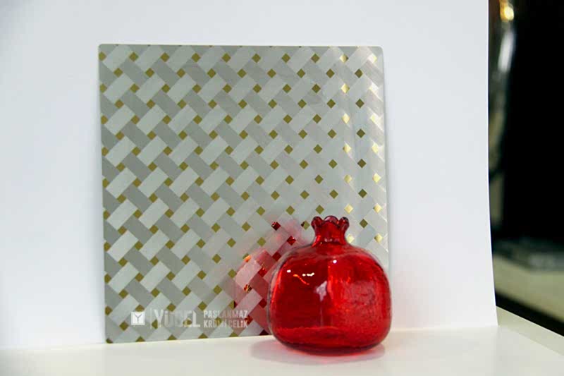 Yeni Desenli Paslanmaz Çeliklerimiz stoğumuzda. Çalışmasını kendimiz yaptığımız desenli paslanmazlar sarı ayna, ayna ve taşlı sarı olarak bulunmaktadır. Desenli Paslanmaz Çelik lerin kalınlıkları 0,80 mm dir. Renkli Paslanmaz Çelik lerin kalınlıkları desenli paslanmazlara göre daha geniştir.